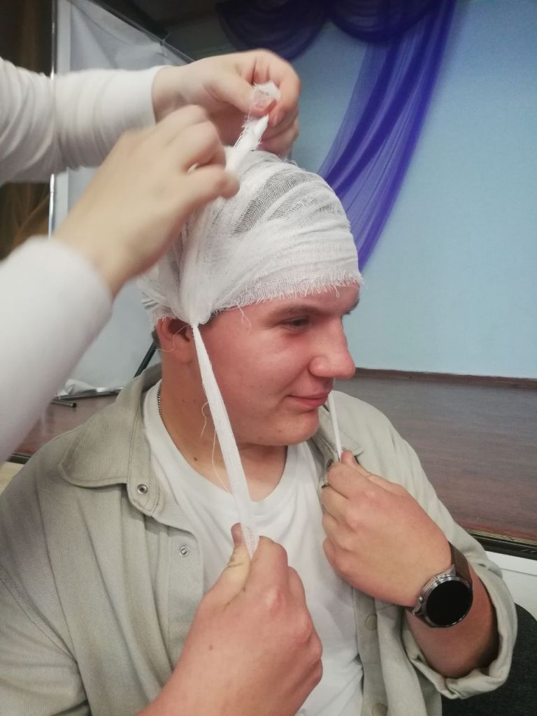 накладывали повязку на голову «раненого» бойца (станция «Эвакогоспиталь»),